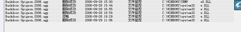 Backdoor.Gpigeon.2006.agp  木马,瑞星杀不掉,只要重启系统就再生成,路径C:/windows/system32/w.DLL