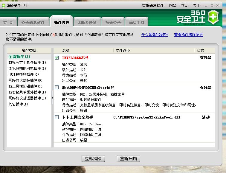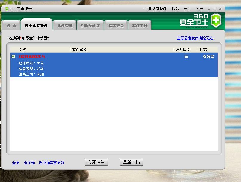 一觉醒来发现ie又被http://www.9505.com/ 锁定了~~~不晓得又是哪个坏蛋搞的。俺用了兔子和卡卡,都没恢复过来,360安全卫士扫描到一个木马~。但就是屡次删除不掉。俺把图捉下来了,请高手哥哥们帮我看一下
