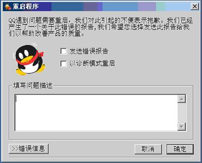 该“重启程序”出现后,上面有一段文字:“QQ遇到问题需要重启,我们对此引起的不便表示抱歉。我们已经产生了一个关于此错误的报告,我们希望你选择发送此报告给我们以帮助改善产品的质量。”下面是两个选项,一是“发送错误报告”,二是“以诊断模式重启”。然后有一个“填写问题描述”的文本框。最下面有三个键,分别是“>>错误信息”、“取消”、“确定”。具体见附图。