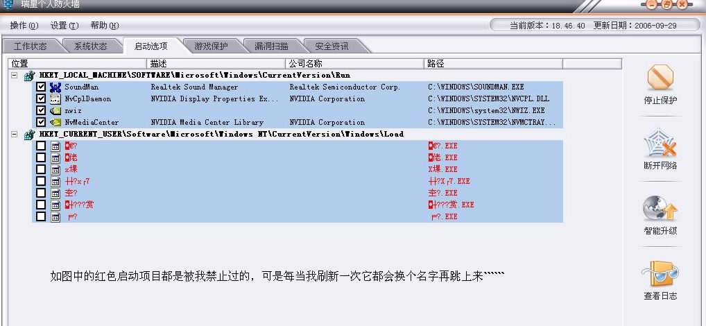 电脑启动QQ非常的慢,开瑞星防火墙后在启动选项中发现了奇怪的东西,如图中的注册表中红色的启动项目,奇怪的是我每刷新一次启动项目,它的启动项目都会改变