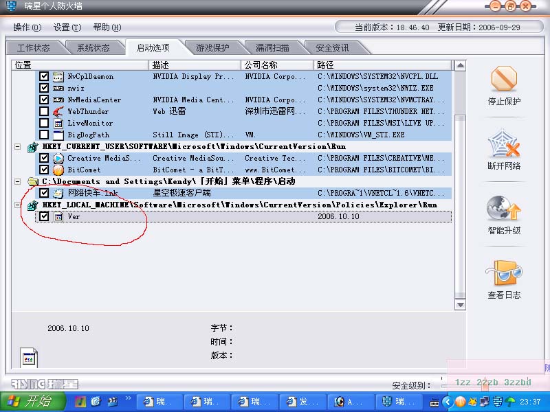 10月10日,TT在不知情的情况下中了木马,不知道是什么东东,在瑞星防火墙启动选项中多了一个ver      2006.10.10  的东东,然后开机的时候TT会自动打开http://t6.mmmmmmm.net/sex686.htm这个网页,提醒下,这是黄色网站!!!如果在防火墙里删掉或禁用这个启动选项,约十分钟机器就会自动重启!重启后又有这个讨厌的东西了。我找不到这个东东的相关资料!不知道怎么样解决,哪位告诉小北一下,小弟不胜感激!!!另外,如果你关掉了打开这个网站的东东,他每十分钟就会启动,挂在机器里!