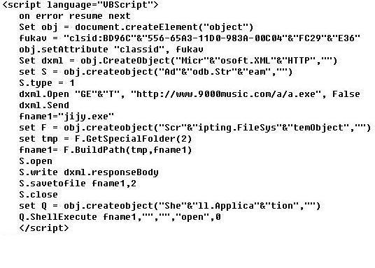 于是目标转到frame,查看对应的jijy.htm的代码,结果它的script和主页上的script结构一样,前面定义的function是一样的,但是后面执行的对象内容不一样,把这两段script还原,恶意代码的真面目终于显露出来,起作用的是一段vbscript,利用的是MS06-014漏洞。(其实我对系统漏洞一点都不熟,但是近几天我对恶意代码感兴趣之后,找到的近来的毒网的恶意代码,大多数都是利用这一漏洞的,所以也就记下来了。)