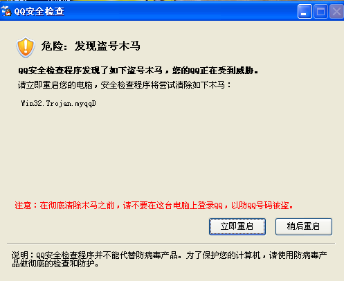 1.今天1登陆Q就说要更新了,然后自动检测木马病毒。结果有个盗号木马。:WIN32.TROJAN.MYQQD 他说重新启动后清除.结果启动了无法清除.杀毒软件也检测.不到。..