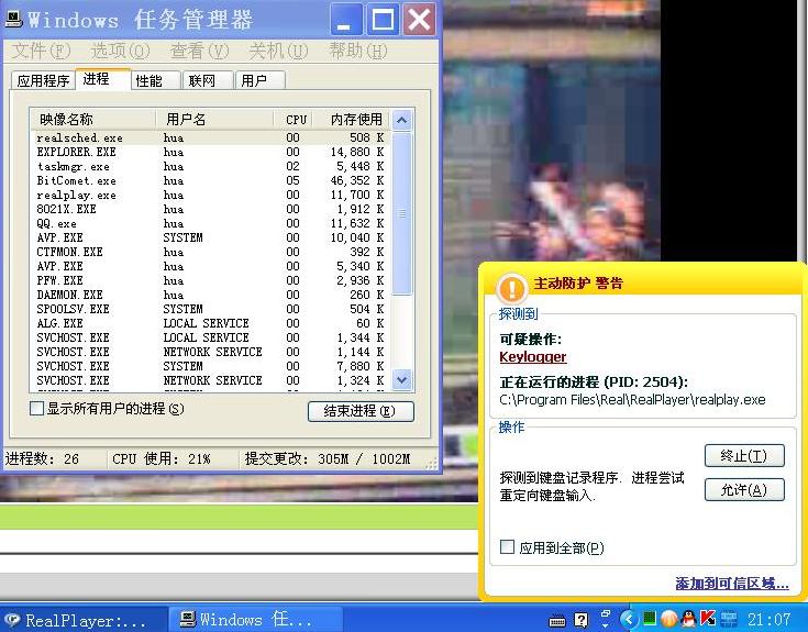 如图,我正在播放一个MP4文件,当我在播放时打开“任务管理器”,卡巴斯基就会报警。