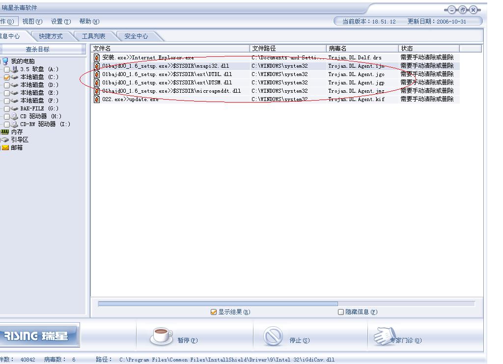 最近用瑞星杀到几个病毒,它提示要我手工删除,但有几个我找也找不到,请高手帮帮忙,它们在哪里呢?(见附图)