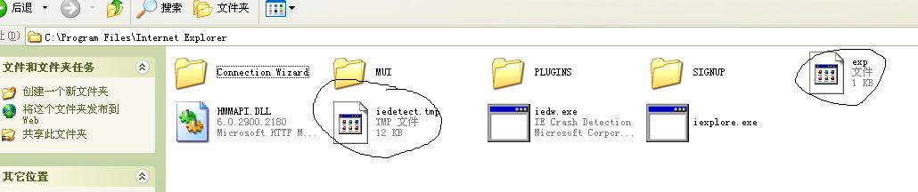 后来,进C:\program files\Internet Explorer\文件夹下,发现此文件夹下比其他电脑多出如图2所示的两个文件,而且IE的蓝色e图标iexplore.exe不可用,从其他电脑上拷了一个iexplorer.exe覆盖,在覆盖好的一瞬间,双击iexplore.exe,能够打开,但是,过了大概不到5秒钟,蓝色e图标又变回dos框形式,再点击的话,又是黑色dos框,请教大虾们,这该咋整呀?