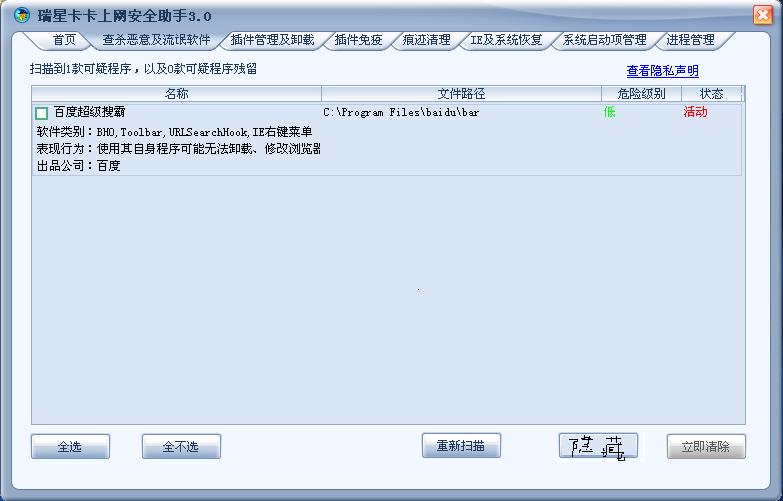 如:瑞星将百度列入“流氓软件”本人不反对,可这是本人必备的工具,操作上不小心给删了,后想到WINXP上打扑丁时,不想打的扑丁可以隐藏起来.卡卡3也可以设“隐藏”选项,以便使人将不想删的东西保护起来.