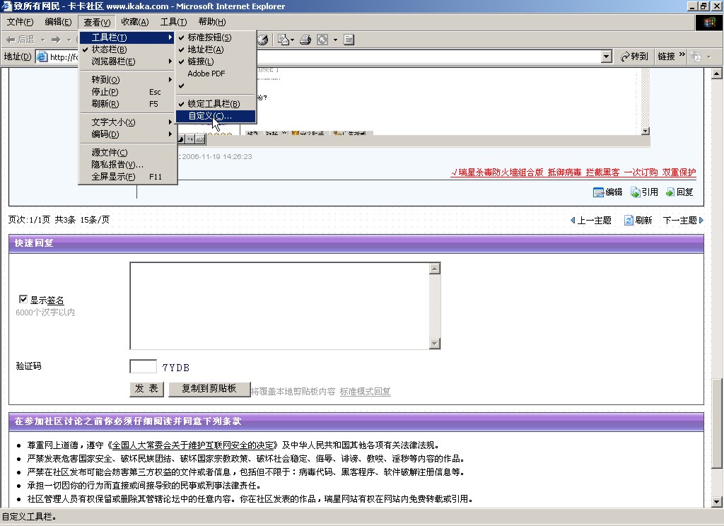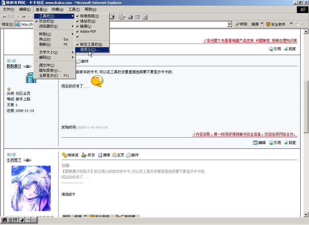 我能肯定一件事,卡卡目前是真正的反流氓软件! 至于以后,我不能肯定还是不是,毕竟现在做流氓软件的都是些大公司,难保往后某时期瑞星也插一脚。 我们也不要单凭多个卡卡工具栏就说瑞星是流氓软件。 卡卡到底是不是流氓软件,我想使用的大家心里最清楚,卡卡收集你隐私了?卡卡装上拒绝卸载了?卡卡乱改你主页了?卡卡就装了个工具栏,但那是为什么?那只不是为了打开方便,你不会卸载就别说不能卸载。自己笨就笨吧,别推到别人身上。 为什么有人会认为卡卡自动装个工具栏,就是流氓软件行为?那是因为大多流明软件都是这样干的,管你同意与否,它就装个工具栏在你IE上,而且还拒绝卸载——也许它根本就没卸载程序,“卸载本软件”那5个字不过是放那儿看看罢了。 长话短说,不想用卡卡就别安装,安装使用了,凭良心就别骂卡卡。就是那些边用着卡卡的,还一边开骂的,这些人渣,我就没择儿了。 不过说实话,卡卡也确实有不如意的地方,比如插件管理,我发现有的插件它不能真正的卸载,比如QQ的"上传到QQ网络硬盘","添加到QQ表情","用QQ彩信发送该图片"等等,类似的插件,我知道它好用,但我还是想卸载它,用卡卡卸了好多次都不行,马上QQ又自己重装上了.不知道是卡卡的问题还是QQ的问题. 我只觉的既然我用KAKA把插件卸了,那么这个插件应该是真的卸了,而不会再重出现.估计这点是QQ的问题吧,它可能是个扫描程序,一但发现它的插件被卸,就自动重装,可能是这样吧,猜测.呵呵. 再者,顺便提提瑞星,瑞星能被强行关闭,用CTRL+ALT+DEL就可以,但卡巴一但开了自我保护,无论如何就不能这样被强行关闭了,我试过.卡巴一但运行起来,就不运行随便被关闭或卸载,这点瑞星是不是该学学?不然老有一但中"镖",瑞星就被强行关闭,我就发生过好几次了,瑞星监控被强行禁用,用信箱联系联系客服N久没给答复,最后还是我自己给解决了. 老实说,如果让我评价瑞星,如果把世界的杀软分为极品-优秀-良好-合格-差,5个等级的话,(只从软件性能上说,不说服务什么的)瑞星只能算优秀中等软件,优秀上品软件都不算,但它还算差强人意,而我愿意支持国产.所以....购买.呵呵.