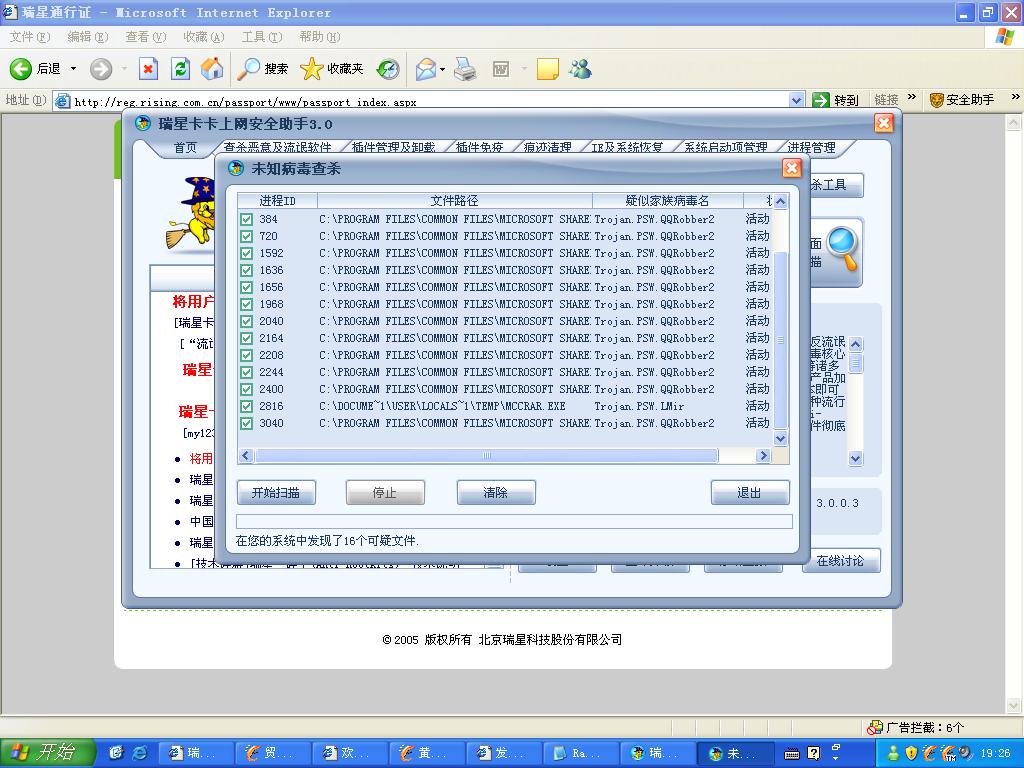 我的电脑里有木马病毒,瑞星升级到最新版本之后,杀毒都很正常。可是持续不了多久,瑞星监测的绿色小雨伞就会自动没了,然后瑞星怎么也打不开。用卡卡助手一查,好多木马病毒。