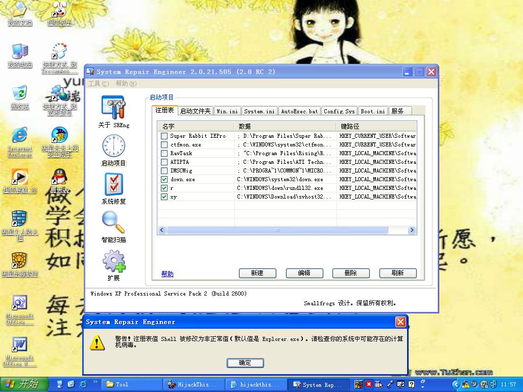 电脑严重不正常了55  连安全模式都进不去了。速度奇慢。还老是出现一个运行错误提示。我杀了下毒,还是无济于事。我把hj和sreng的日志贴上来请高手们帮我看看吧。谢谢啦