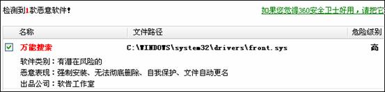 系统启动项里不请自来一位"WNSO",正版瑞星和卡卡3.0都视而不见。倒是360卫生扫出该程序为高危流氓“万能搜索”,但它也是只能诊断,却没法医治。
