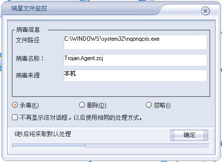 求解!小弟在不知道什么状况下(不上非法网站,私人网页,不安全论坛,不安全链接的情况下)突然中了这个Torjan.Agent.zci,貌似是个木马?是瑞星监控下查出的,但是怎么杀也杀不了,每次删除之后瑞星又会弹出发现此病毒,此毒所在文件地址为:C:\\WINDOWS\system32里面,病毒文件名为nqonqcris.exe,不定时的此毒会被瑞星监控到,杀完之后不定时瑞星又会弹出查到此毒,小弟我十分苦恼,而且每次打开IE浏览器瑞星也会查到此毒,求各位杀毒达人指导我这个菜鸟,急,万分感谢!