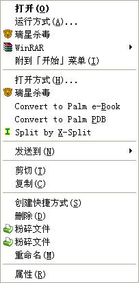 在桌面上的图标点右键,出现图一的情况,有两个"瑞星杀毒",和两个"粉碎文件"这个只是桌面上的快捷方式有这个现象,其它的文件,比如C盘的根目录下的都只有一个,正常.——杭州论坛xn0512,首先发现,我试了试,跟他一样。。。。。