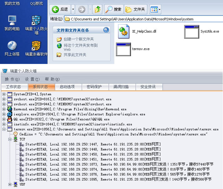 用瑞星防火墙可看到他名字:termsv.exe而且多端口连接几个甚至十几个网站