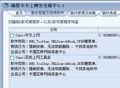 我用瑞星卡卡上网安全助手3.1.0.12,查出的的电脑有流氓软件,删除并重起了几次,也删除不掉。。。