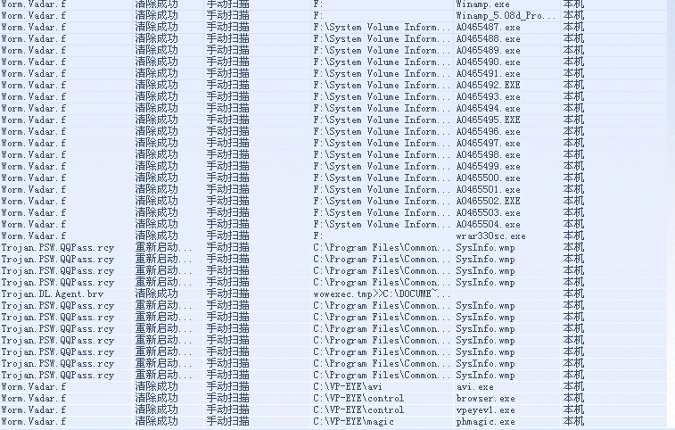 我已经把瑞星升级到最新了.昨天晚上在安全模式下杀出差不多500个病毒.但是最"顽固"的俩种类型是Trojan.PSW.QQPass.rcy,和WORE.VADAR.F.