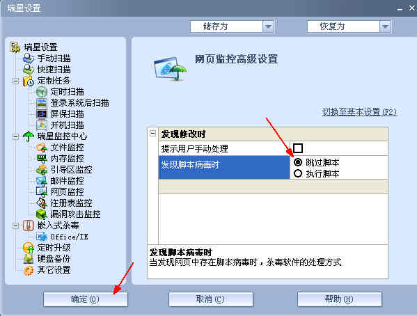 请问个位大虾瑞星里的网页设置怎么设置才能防病毒啊!在高级设置里当发现脚本病毒时是跳过脚本还是选择执行脚本呢!