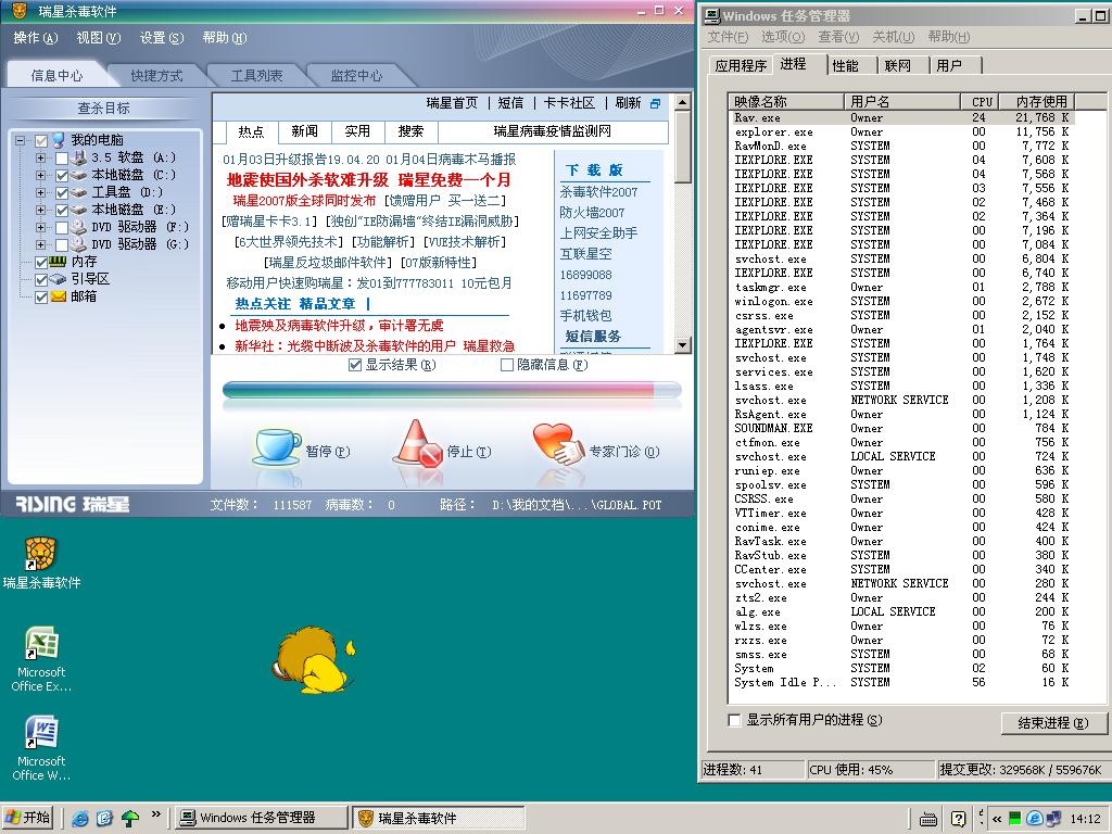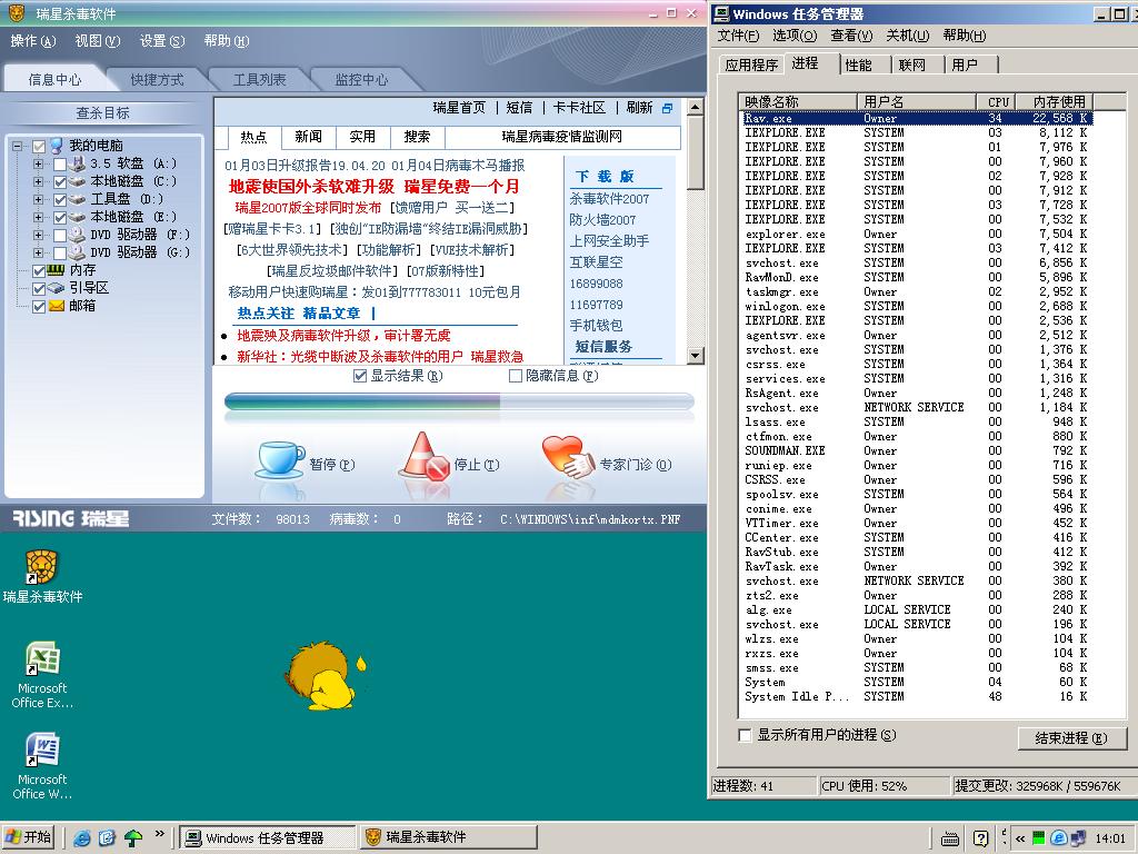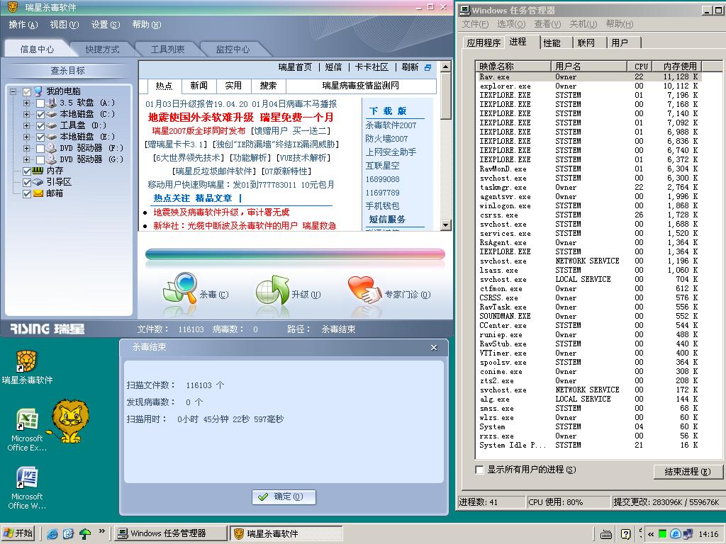 windows xp sp2 rising 2007 病毒库版本19.04 升级时间07年1月1日.