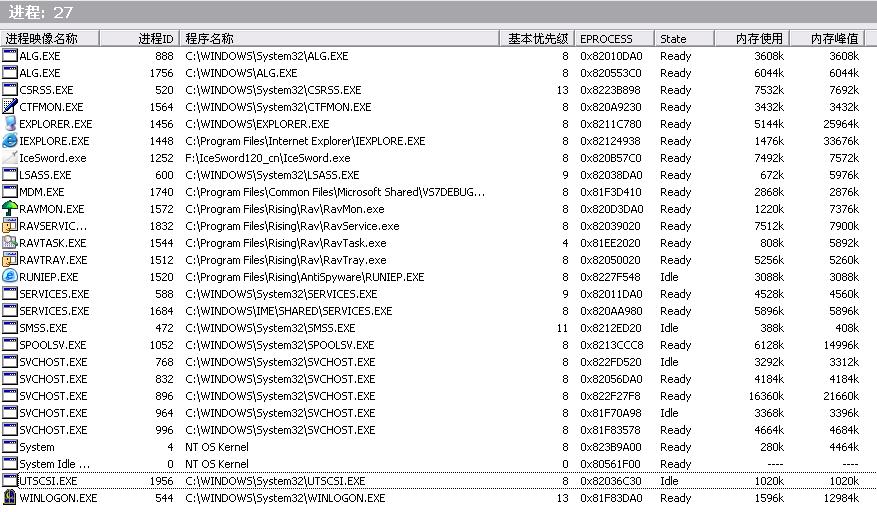 我的电脑开机后会有1-2声系统提示音,但没有提示窗口,瑞星监控中心所有监控都监用,无法打开,一打开任务管理器窗口和注册表窗口就会自动关闭。我用IceSword打开进程列表看了一下,发现有2个alg.exe,2个services.exe,一个utscsi.exe,不知道是什么,大家帮我看一下啊~~~~