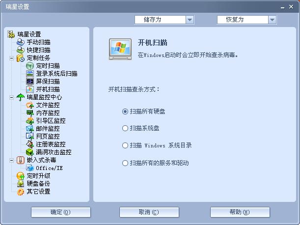 打开瑞星杀毒软件 设置 详细设置 定制任务 把开机扫描选中