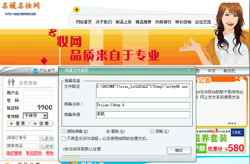 为何我每次打开我的网站:名媛名妆网(网址:http://www.92fair.com)时,会出现病毒Trojan.Cdnup.b。清除或删除后,下次再打开时还会有。请哪位高手帮帮我,我先拜谢了!!