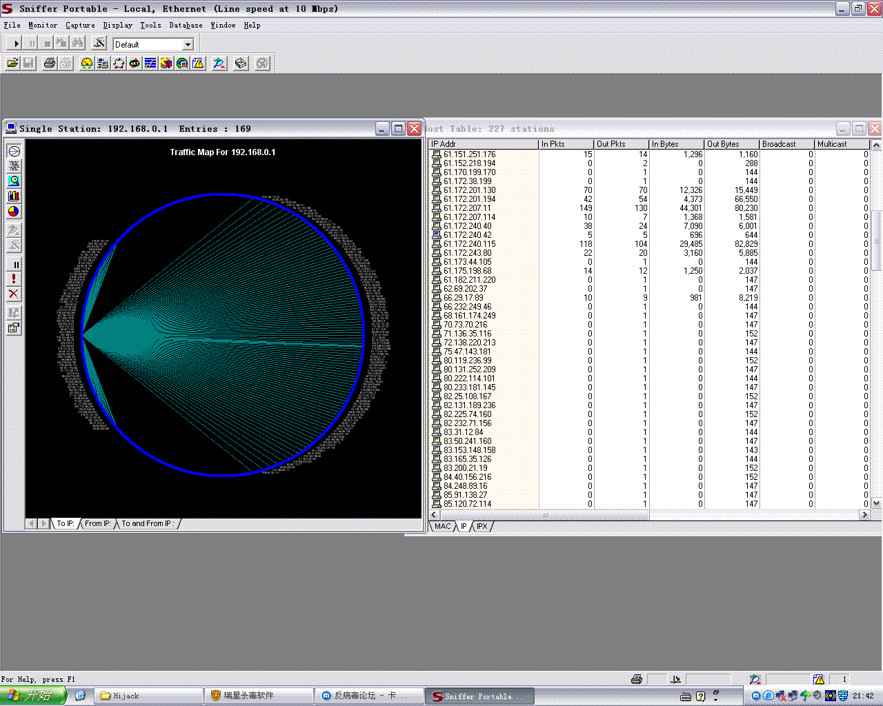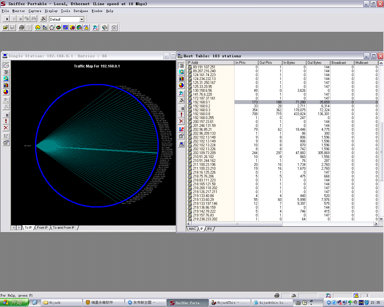 网上下了一篇文章,结果是EXE结尾的,应该是WORD,结果点了没反映时才发现结尾是EXE,后来查过一遍毒,杀里2个,而且是成功杀了的,但是发现机器不停的连其他机器,用SNIFFER抓包发现的,而且速度很快,几分钟就连了将近百来个,以下是用HIJACK得出的,看看是不是哪里有问题