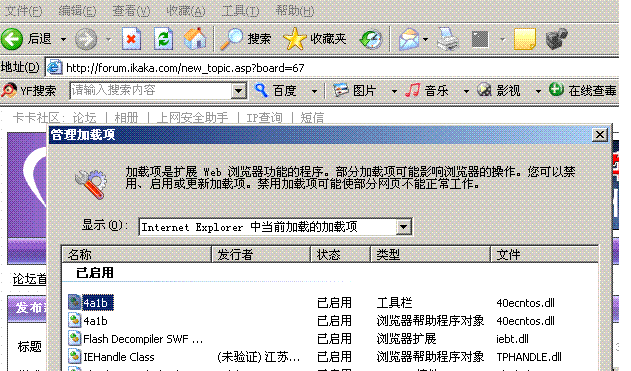 卡卡杀不掉,清除之后开机又出现,而且在IE-工具-管理加载项-点禁用后又会返回到启动状态,在加载项里名为“4a1b”