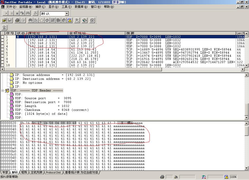我们局网中老有机器疯狂的发包用sniffer抓包发现内容如截图。每个包里全是垃圾,如全是a。请各位看看是不是病毒引起的。