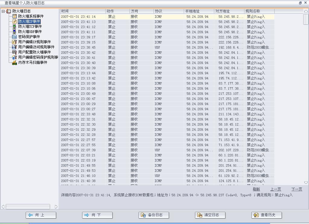 我的防火墙报警频繁,日志显示的事件都是类似的,大家帮忙看一下,是什么原因使得防火墙这么频繁的报警呢?存在危险吗?多谢了!!!