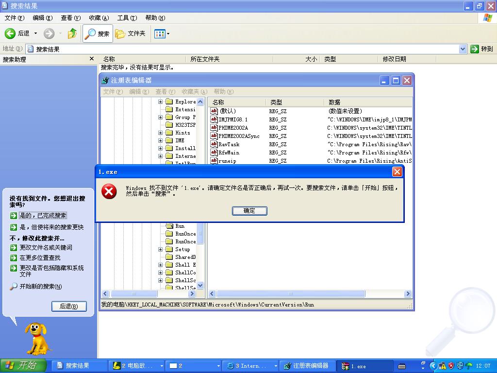 求求各位大侠,我开机时出现Windows找不到文件'1'exe.瑞星监控出现Trojan.Tbinstall.a病毒清除,但此后每隔10分钟以上情况反复出现,用瑞星杀了多次都提示文件被删除,但没用,10分钟以后又出现,安全模式下杀毒也没用.我该怎么办,求求各位.