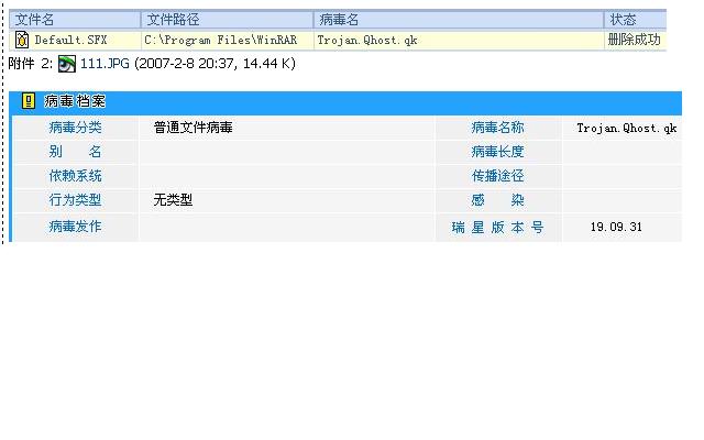 瑞星杀毒软件19.09.31误报winrar3.62的Default.SFX文件为Trojan.Qhost.qk病毒