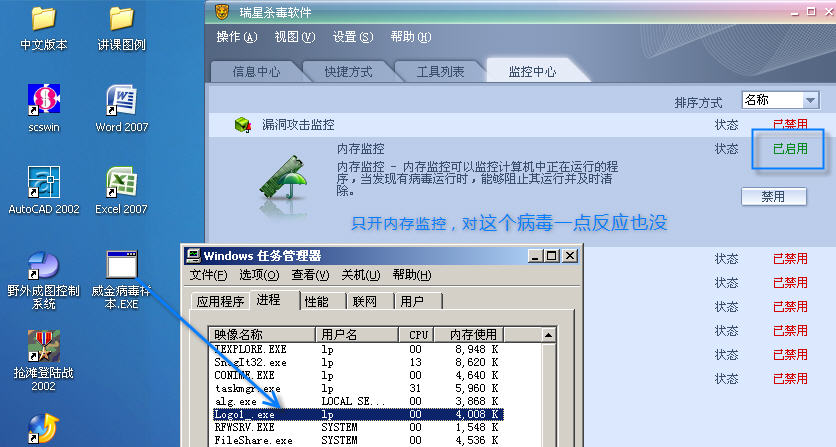 前几天借来的小黑上又感染了威金变种,打开任务管理器,总觉得logo_1.exe这个进程看起来很不舒服,于是升级了瑞星,小伞是绿的,版本是最新的,我就纳闷,为什么内存监控对这个病毒毫无反应呢?于是,我打开主程序,选择查杀目标为内存,果然1秒之后就发现logo_1.exe果然是威金的变种,于是,我又试了其他几个病毒(Worm.snake一类的小病毒),可是内存监控依然是毫无反映,如果偶然一次不能说明问题的话,那么那么多病毒总可以说明问题了吧!大家怎么看