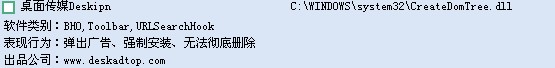 不小心同意了一个桌面传媒deskipn的插件。到目前为止能用的招能想到招能学到的招都用了,就是杀不到。卡卡助手每次清除都说要重新启动后再删除,结果每次都删不掉.而且卡卡助手提示残留的软件文件(3个文件均为system32\下)dos下却找不到。命令提示符下就更不用说了,都没有!