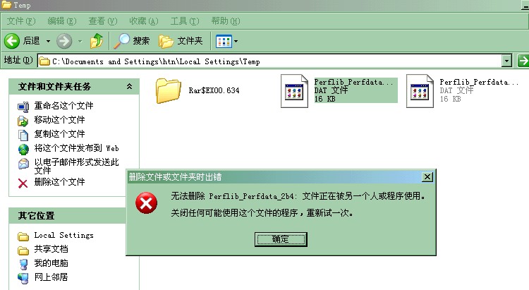 我在删除C:\Documents and Settings\LocalService\Local Settings\Temp文件夹下发现两个总是删除不掉的两个文件"Perflib_Perfdata_774.dat"和"Perflib_Perfdata_a24.dat"。不知道是什么流氓软件安装进入的,每次在清理TEMP下文件时总提示文件被程序在使用所以不能删除,进入安全模式删除了这两个文件但是正常启动后这两个文件又在了。