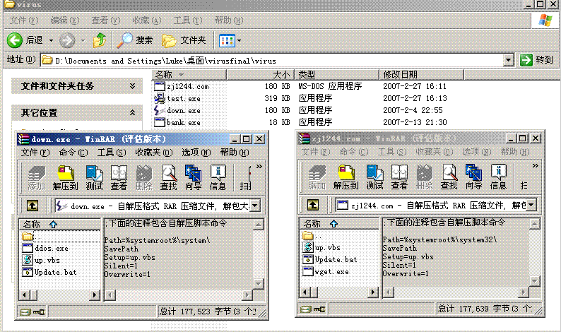 其中zj1244.com和down.exe均为Winrar自解压缩包。test.exe为一安装程序(打开将复制一份到%windir%并改名为Nerocheck.exe,并释放两个文件nerocheck.dll、nerocheckkey.dll。这两个文件均被瑞星报为Backdoor.Gpigeon.2006.bcy)。至于Bank.exe在Windows 2000 sp4下面会报错......