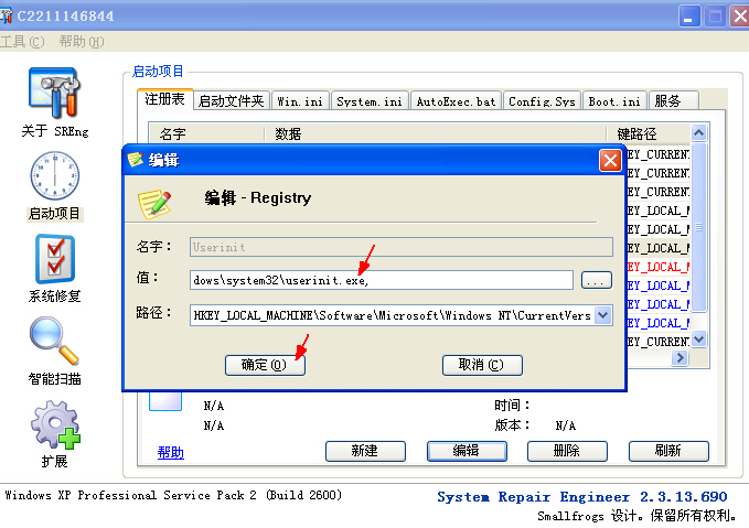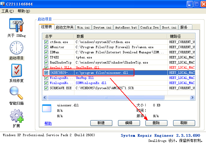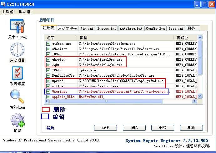 注:因为病毒动态插入应用程序进程,因此,不建议先用SRENG删除病毒启动项。按照本帖的杀毒顺序操作,可以顺利清除病毒。