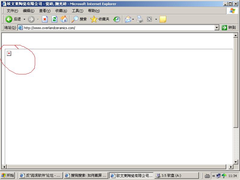 为什么我打开网页http://www.overlandceramics.com时只显示一个空白,左上角有个红X,请问怎么样才能访问?