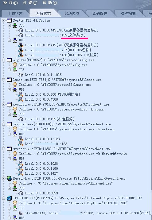 瑞星显示的系统状态中139等端口没问题吧。请指教!!