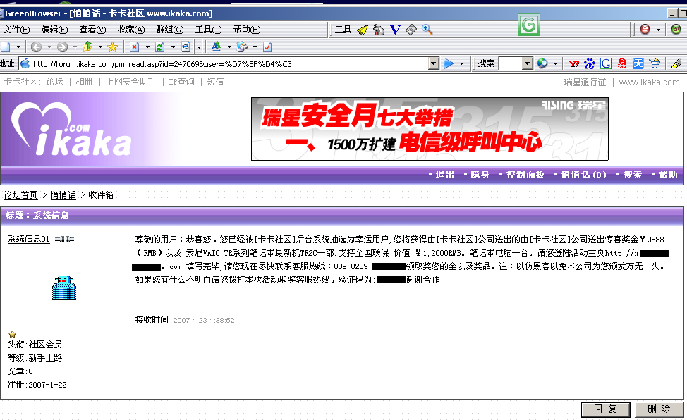 尊敬的用户:恭喜您,您已经被[卡卡社区]后台系统抽选为幸运用户,您将获得由[卡卡社区]公司送出的由[卡卡社区]公司送出惊喜奖金¥(本人屏蔽数字)(RMB)以及 索尼VAIO TR系列笔记本最新机TR2C一部.支持全国联保 价值 ¥(本人屏蔽数字)RMB。笔记本电脑一台。请您登陆活动主页http://x*********e.com 填写完毕,请您现在尽快联系客服热线:089-8239-****-***(本人屏蔽电话号码)领取奖您的金以及奖品。注:以仿黑客以免本公司为您颁发万无一失。如果您有什么不明白请您拨打本次活动取奖客服热线,验证码为:[(本人屏蔽数字)] 谢谢合作!