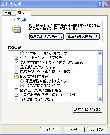 请打开我的电脑,单击-工具-文件夹选项-查看,把你的设置和我一致。。