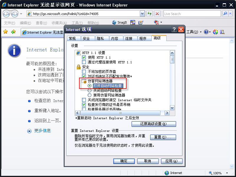 IE7目前也有类似的防钓鱼功能,如图但是使用该功能后会略微影响网页打开速度,但是安全于流畅就要靠用户自己权衡了。