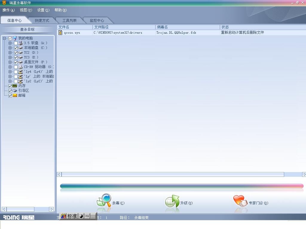 那位大侠能帮帮我呀,我用瑞星查杀后,提示我重新启动后删除。可我重新启动后病毒还在呀。在安全模式下杀也是同样的结果。