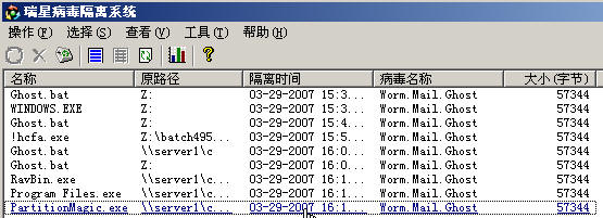 然后开启瑞星2007在服务器D盘根目录发现Ghost.bat文件,结果没有报有毒,发现*.exe文件,依然没有报毒,发现WINDOWS.EXE依然没有报毒,可是右键点瑞星杀毒,却可以杀掉,不点不杀,起先我还以为是瑞星的监控能力差,可是在-运行里面打开server1号服务器,在进入C盘根目录,发现Ghost.bat直接提示,发现*.exe直接提示,发现WINDOWS.EXE直接提示,怪了,一样的服务器不一样的提示,终于回个弯来了,原来在网络驱动器的路径下,就不会提示,而且应该是根本就不监视病毒,而在正常路径下就会提示,我希望瑞星公司能够把这个不知道算不算BUG的小问题解决一下,下面附张图片