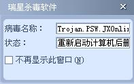 一打开卡卡按"立即升级"或"在线讨论"瑞星就弹出对话框,说中了病毒:Trojan.PSW.JXOnline.am这是什么病毒,怎么删除?