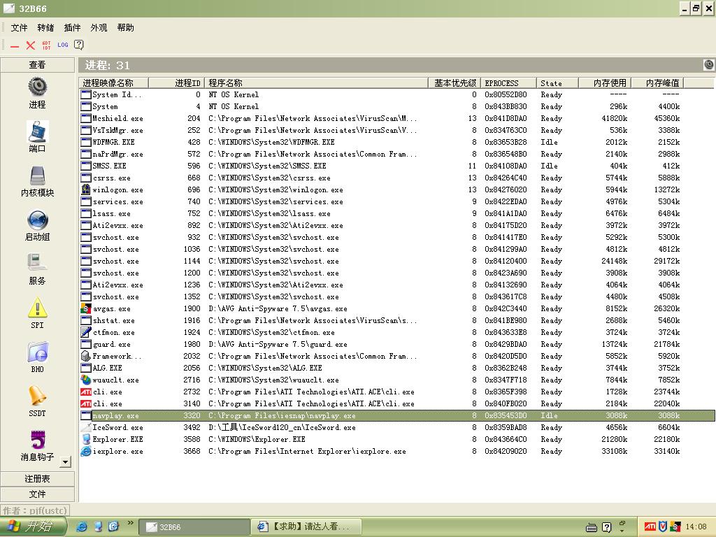 按4楼达人操作,该进程c:\PROGRA~1\iesnap\navplay.exe结束后系统崩溃,重启后用iceword禁止线进程创建,然后用POWERRMV清除,并抑制文件生成 输入以下