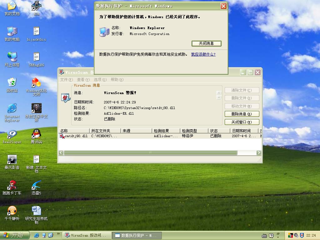 浏览器会出问题,同时会提示发现病毒ADCLICKER-ER.DLL。然后浏览器会自动关闭再打开一次。然后继续正常使用。再开机,仍然出现这样的情况。用powerrmv,输入路径,发现该文件不存在