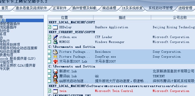启动项目 注册表 找到<twin><C:\WINDOWS\system32\twunk32.exe> [Microsoft Corporation]一项