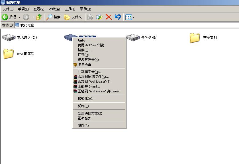 昨天休息,今天早开机打开D盘时,出现自动播放的选择窗,C盘也是,右击发现C盘和D盘的首项是"AUTO",只有E盘没有.上网查了一下,说现在的杀毒软件还没有把这个病毒纳入病毒库.杀不了.郁闷了.