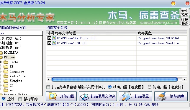我是用了最新版的木馬分析專家查的,查到後因為沒有注冊所以不能刪!然後下載了瑞星的免費下載版就下了看看,沒想到竟然查不出來?