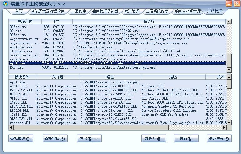 以前此进程名为:dservices.exe,现在更名为upnt.exe,文件路径在:C:\WINNT\system32\dllcache,加入系统服务中,并且禁用“停止”服务按钮,中止Norton杀毒软件服务,结事此进程后会自己重启,出来一图形窗口,窗口几秒后自动消失,此程序一运行,不停向外发送数据,机器速度变慢,疑为通过网络传播,以前进和名为dservices.exe时,杀毒软件可以杀,现在无法查出,流氓软件清理工具也不识别此进程。解决方法:禁用此服务,结束此进程,强行删除此文件,或者安全模式下清理,清理完毕后,加装防火墙。附图片如下